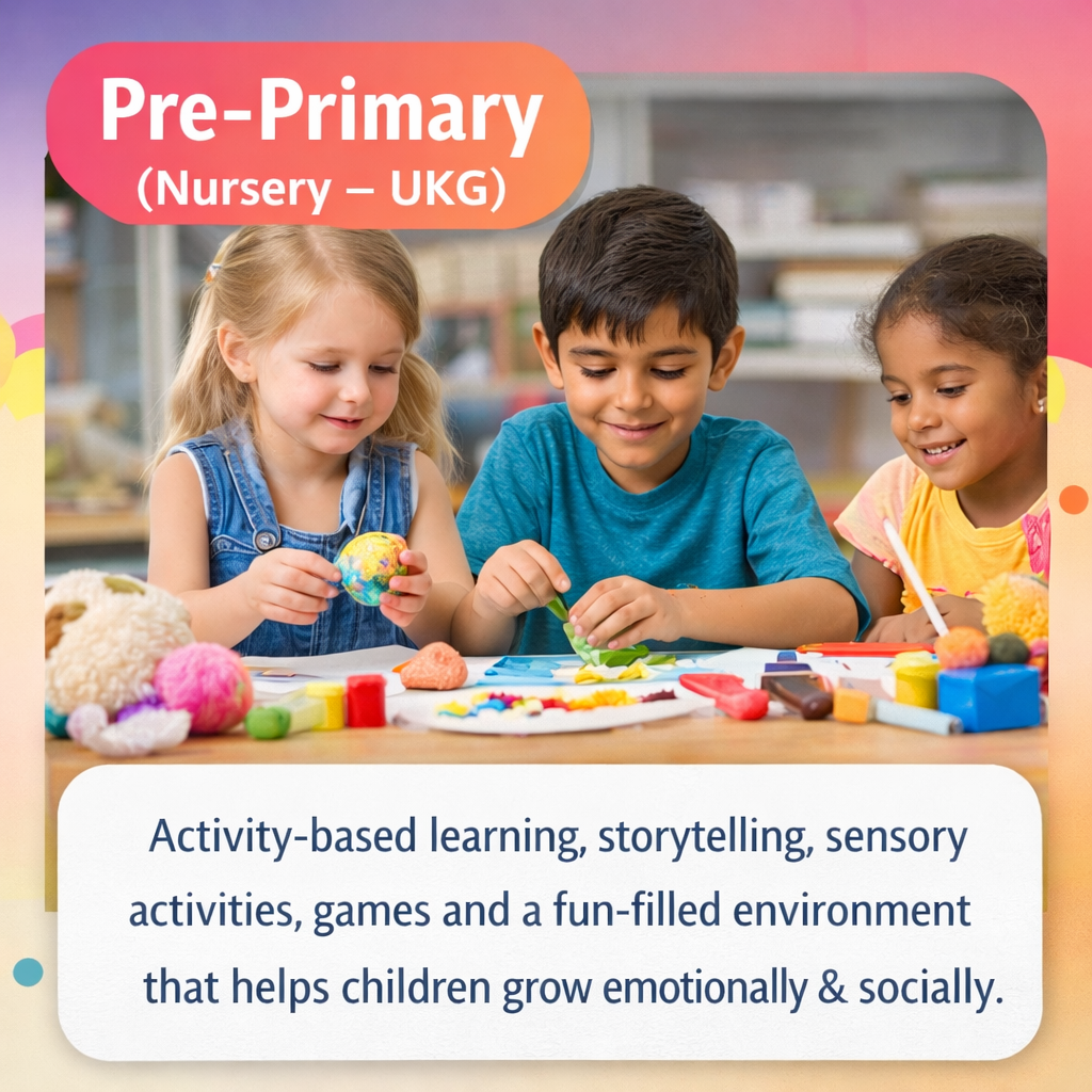 Activity-based learning, sensory play, storytelling, games, motor skill growth, emotional building & joyful classrooms for early development.