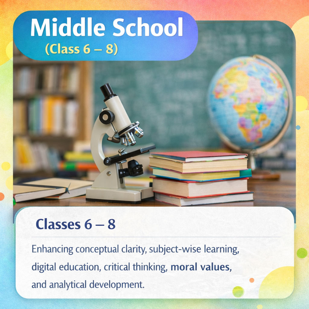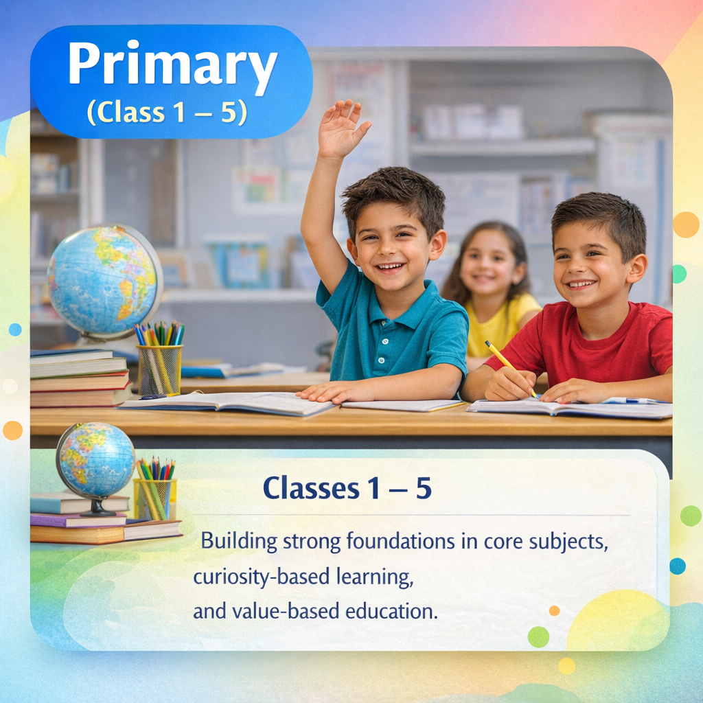 Strong foundation building through interactive teaching, communication skills, value education, curiosity-driven learning & confidence enhancement.