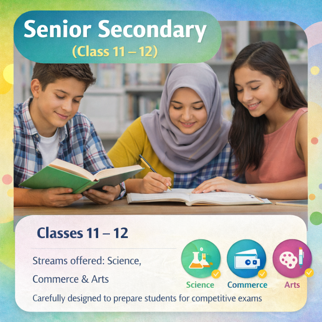 Streams: Science, Commerce, Arts. Focused academic pathway, competitive exam preparation, and strong career-oriented foundation.